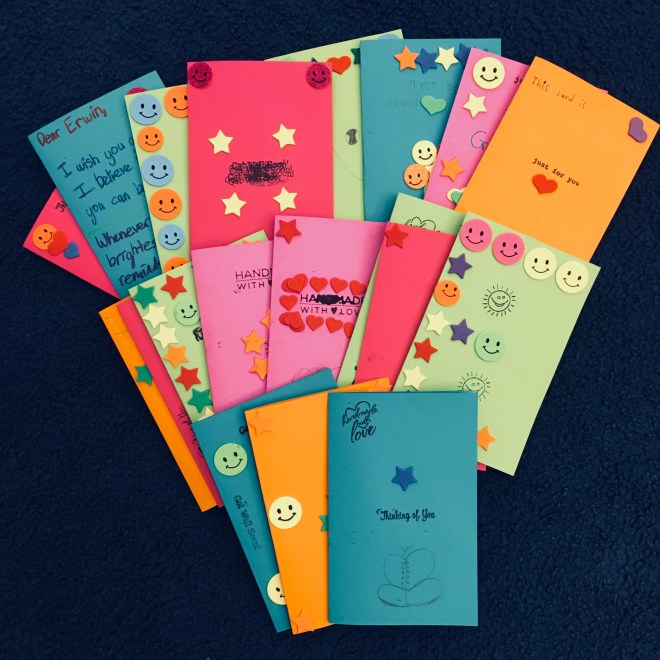 This simple outreach put twenty sets of little hands in action: students created cards for the high school student, inscribing each with words of encouragement, calls for strength, and messages of love and hope.
